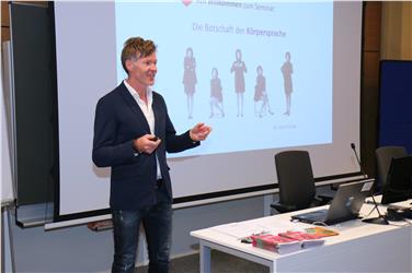 Nach der Begrüßung stand ein Vortrag von Karl Kirchler zum Thema "Körpersprache – Botschaft der Gefühle" auf dem Programm. In seinen Ausführungen ging er darauf ein, wie sich Körper und Gefühl gegenseitig beeinflussen. Aber auch die Stimme spiele eine bedeutende Rolle, erklärte Kirchler. "Wenn Beziehung im Zwischenmenschlichen passt, dann kann ich fast alles auf Sachebene sagen", gab er zu verstehen. Daher sei es wichtig, sich der eigenen Körpersprache bewusst zu sein, aber auch jene des eigenen Gegenübers richtig zu interpretieren. "Wie du bist, übertönt deine Worte", lautete eine seiner zentralen Aussagen. Zwischenmenschliche Kommunikation verläuft zu einem hohen Prozentsatz nonverbal über Gestik, Mimik, und Körperhaltung: "Wer sich mit Körpersprache beschäftigt, wird Überraschendes und Interessantes erfahren und sich selbst und andere besser verstehen", berichtete Kirchler, der den Vortrag durch zahlreiche Beispiele veranschaulichte und mit Übungen auflockerte.