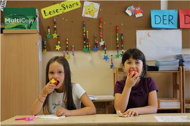 - Obst und Gemüse kennengelernt und in Gemeinschaft gerne gegessen: zwei erste Klassen der Grundschule Bozen-Haslach haben sich in diesem Schuljahr am EU-Projekt "Frutta nelle scuole" beteiligt. Foto: LPA/Maja Clara [JPG 18 KB]