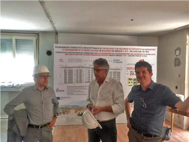 Es sei dies, lobte Landesrat Tommasini bei der Baustellenbesichtigung, ein bedeutendes und innovatives Beispiel von energetischer Sanierung an veralteten Infrastrukturen. Dank der Investitionen der Landesverwaltung und der Kompetenz des WoBI könnten innovative Konstruktionstechniken von höchstem Standard zum Wohle der Bürger angewandt werden. Dieser Einsatz, unterstrich Landesrat Tommasini, sei keineswegs selbstverständlich. WoBI-Präsident Schweigkofler verwies darauf, dass die Sanierungsarbeiten durchgeführt werden, während die Bewohner in den Wohnungen bleiben. Diese wurden vorab informiert und stehen in ständigem Austausch mit dem Wohnbauinstitut und der Baufirma. Nach der Sanierung, erklärte Ingenieur Minotti vom WoBI, sinkt der Energieverbrauch von derzeit 180 Kilowattstunden pro Quadratmeter pro Jahr auf 20 Kilowattstunden pro Quadratmeter im Jahr. Für die Wiedergewinnung der Dachgeschosse werden innovative Techniken eingesetzt, mit vorgefertigten Lamellen und Wänden aus Holz aus dem Fleimstal.