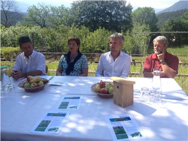 Projekt der Zusammenarbeit zwischen der Agentur Landesdomäne und der Sozialgenossenschaft Salvia vorgestellt (v.re.): LR Schuler, Salvia-Präsidentin Nagler, Domänen-Direktor Schmiedhofer. Foto: LPA/GNews