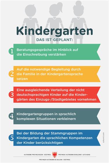 Das von Landesrat Achammer vorgestellte Konzept sieht mehrere Handlungsebenen vor, die im Kindergartenjahr 2018/19 zum Tragen kommen. Insbesondere soll die Beratung der Familien im Zuge der Einschreibung weiter gestärkt werden. Alle Familien, die ein Kind im entsprechenden Alter haben, werden für Anfang Dezember des Jahres vor der Einschreibung zum Tag der offenen Tür in den Kindergarten eingeladen. Eltern, die die Sprache des Kindergartens nicht sprechen, werden bei dieser Gelegenheit auf die Anforderungen an die Familien bei der Begleitung der Kinder aufmerksam gemacht. Die Familien werden auch darauf hingewiesen, dass ihnen ein Kindergartenplatz in einem der verschiedenen Kindergärten des Einzugs- bzw. Stadtgebietes zugeteilt werden kann, um eine möglichst gleichmäßige Verteilung zu gewährleisten.