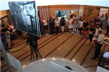 Der geschäftsführende Direktor der Landesabteilung Deutsche Kultur Volker Klotz hat die Ausstellung heute, 23. August, offiziell eröffnet und insbesondere auch die anwesenden Angehörigen der Familie Waldmüller willkommen geheißen. In seinen Grußworten unterstrich er den kooperativen Gedanken, der hinter der Ausstellung steckt und zwei Abteilungen des Landes zusammengeführt hat. Zusammen mit den Praktikanten habe sich ein kreatives Team herausgebildet, stellte der Abteilungsdirektor fest. "Dank dieser Ausstellung wird das öffentliche Gebäude zu einem Kultur- und Begegnungsort", unterstrich Klotz.