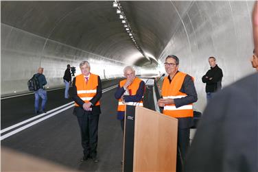 Nach der Segnung des neuen Straßenabschnitts durch Pater Josef Hellweck wurde der Tunnel und der dazugehörige Straßenabschnitt symbolisch durch das Banddurchschneiden von Landeshauptmann Kompatscher, Landesrat Mussner, Bürgermeister Lintner und Pater Hellweck eröffnet. Die erste Fahrt durch den Tunnel erfolgte mit dem Wasserstoff-Bus und Elektrofahrzeugen. Der gesicherte Straßenabschnitt ist nun für den gesamten Verkehr befahrbar.