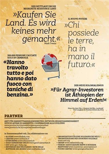 Weltweit, und besonders in Ländern im Globalen Süden, ist ein Wettlauf um die begrenzte Ressource Land im Gange. Kleinbauern verlieren ihre Lebensgrundlage, Monokulturen zerstören wertvolle Natur- und Kulturlandschaft. Die Gewinner sind einige wenige: korrupte Regierungen und große Unternehmen. Der diesjährige Tag der Entwicklungszusammenarbeit, den das Landesamt für Kabinettsangelegenheiten in Zusammenarbeit mit verschiedenen  Organisationen veranstaltet, beschäftigt sich daher mit dem Thema "Landraub. Das Ringen um die Böden im Süden der Welt". Der Tag der Entwicklungszusammenarbeit findet am Dienstag, 24. Oktober, an der europäischen Akademie Eurac statt. Beginn ist um 8 Uhr.