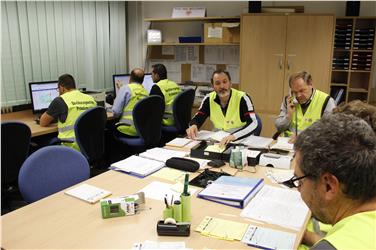 - Leiter Stab der Hochwasserzentrale Peter Egger (am Telefon) mit seinem Team während der Übung. Foto: LPA/Maja Clara [JPG 21 KB]