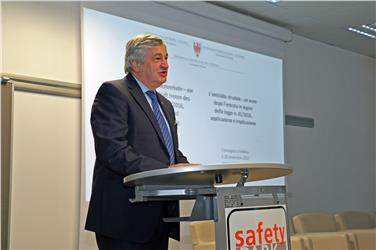 "Ich hatte fünf Gläser Wein getrunken und konnte nicht mehr reden, aber ich konnte noch gerade gehen und hatte das Gefühl, ich kann auch noch Autofahren", berichtete Verkehrspsychologe Max Dorfer über seinen eigenen Fahrversuch, den er unter der Kontrolle des österreichischen Kuratoriums für Verkehrssicherheit durchgeführt hat. Dabei zählte er den Kontrollverlust durch Alkoholkonsum neben dem zu schnellen Fahren als wichtigen strafverschärfenden Umstand auf, den das neue, am 24. März 2016 in Kraft getretene Gesetz über die Tötung im Straßenverkehr beinhaltet. Um dieses Gesetz im Speziellen und das Sichere Fahren im Allgemeinen sowie Alkohol am Steuer ging es bei der Tagung des Mobilitätsressorts des Landes am heutigen Montag (20. November) im Safety Park. Über 100 Teilnehmer nahmen an der Veranstaltung in Pfatten teil.