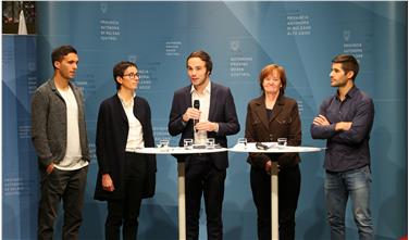 - Stellten Maßnahmen und Kampagne vor: FC Südtirol-Kapitän Hannes Fink, Schulinspektorin Martina Rainer, die Landesräte Philipp Achammer und Martha Stocker und Eishockeyprofi Anton Bernard - Foto: LPA/Ingo Dejaco [JPG 15 KB]
