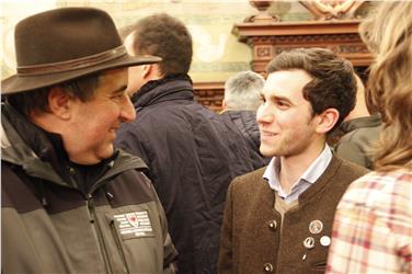 Gratulation zur bestandenen Jägerprüfung: Landesrat Schuler (re.) im Gespräch bei der Feierstunde für frisch diplomierte Jägerinnen und Jäger. Foto: LPA/Maja Clara