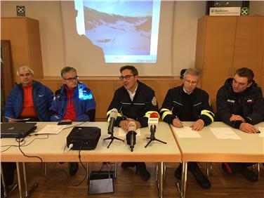 - Pressekonferenz (v.li.): Bevölkerungsschutz-Chef Pollinger, Bürgermeister Heinrich Noggleer, LH Kompatscher, Regierungskommissär Cusumano, Oberst Massimo Mennitti, Kommandant der Carabinieri Südtirol-Trentino. Foto: LPA/GNews [JPG 20 KB]