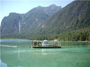 - Entschlammungsarbeiten (im Bild das Spezialboot am Toblacher See) sind eine mögliche Maßnahme, um den guten ökologischen Zustand des Sees beizubehalten. Foto: Biologisches Landeslabor [JPG 30 KB]