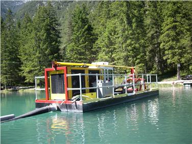 - Die seit 2010 durchgeführte Sedimententfernung im Toblacher See konnte beendet werden: Im Bild das Spezialboot "pitHog" bei der Arbeit. Foto: Biologisches Landeslabor [JPG 18 KB]