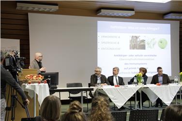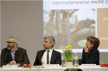 - Birkenpollenallergie mit Äpfeln therapieren: (v.li.) Laimburg-Direktor Oberhuber, Landwirtschaftslandesrat Schuler, Gesundheitslandesrätin Stocker während der Ausführungen von Dermatologie-Primar Eisendle. Foto: LPA/Maja Clara [JPG 15 KB]
