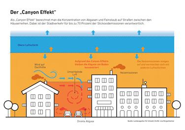 - Infografik Canyoneffekt: Der Canyon-Effekt tritt vor allem an viel befahrenen Straßen zwischen dichten Häuserreihen auf, in Bozen beispielsweise in der Romstraße. [JPG 18 KB]