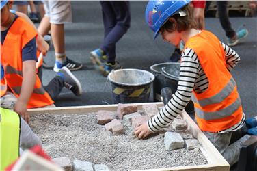 Kinder der dritten, vierten und fünften Klasse Grundschule erhalten dabei auf einer eigens errichteten Baustelle kindgerecht aufgearbeitete Informationen über die verschiedenen Berufe im Bauwesen und können an 13 verschiedenen Aktionen auch Hand anlegen und planen, messen, mauern, pflastern oder zimmern.