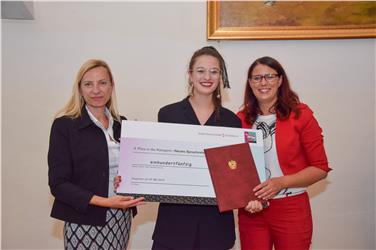 - Dritter Platz in der Kategorie Neues Sprachrohr: Anna Künig (Mitte) mit Jugendlandesrätin Sara Schaar (re.) und Jugendministerin Juliane Bogner-Strauß (li.). Foto: LPA [JPG 14 KB]