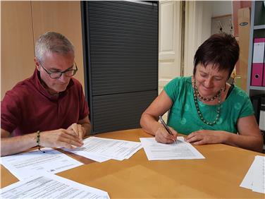 - Die heutige Vertragsunterzeichnung durch Riccardo Ruffini vom Verein ProNepal und Irma Werth vom Verein "Irma hilft" - Foto: LPA [JPG 19 KB]