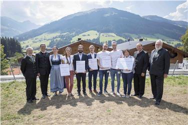 - vlnr: Michl Ebner, Arno Kompatscher, Barbara Thaler (Vizepräsidentin Wirtschaftskammer Tirol), Karoline Sakowska, Hannes Schuler, Adrian Lindermuth, Matthias und Moritz Moroder, Nadia Zorzi, Josef Geisler, Franz Fischler - Foto: Land Tirol/Sedlak [JPG 22 KB]