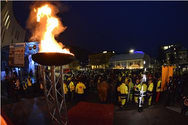 Von der Mariensäule in der Oberstadt zogen Abordnungen zum Rathausplatz, wo Mitglieder des Landesforstkorps die Fahne hissten. Biathlet Lukas Hofer und Skirennläuferin Manuela Mölgg haben das Wettkampf-Feuer entzündet und damit die Sportwettkämpfe eröffnet.