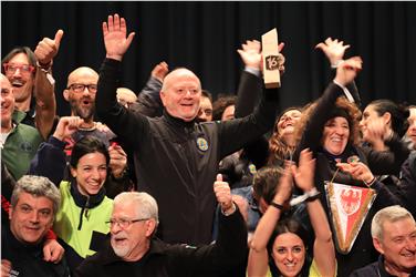 - Freudige Stimmung bei der Preisverleihung, im Bild die Mannschaft der haupt- und ehrenamtlichen Zivilschützerinnen und Zivilschützer aus den Abruzzen. Foto: Maja Clara [JPG 23 KB]