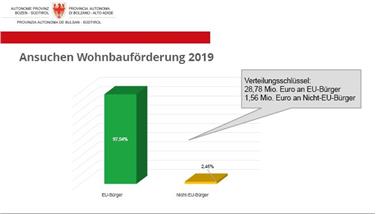 Was den Bedarf an Wohnbauförderungen betrifft, so liegt dieser bei den Nicht-EU-Bürgern mit insgesamt 32 genehmigten Ansuchen bei 2,46 Prozent. Die EU-Bürger haben mit 1267 hingegen 97,54 Prozent der genehmigten Gesuche vorgelegt. 2017 wurden insgesamt 1299 Gesuche genehmigt. Daraus ergibt sich der Verteilungsschlüssel für 2019, nach dem 94,85 Prozent der Mittel für die Wohnbauförderung an EU-Bürger gehen, was rund 28,78 Millionen Euro entspricht. 5,15 Prozent der Mittel für Wohnbauförderungen und somit rund 1,56 Millionen Euro werden Nicht-EU-Bürgern zugewiesen.