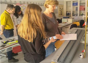 Dabei konnten die Kursteilnehmenden viele Versuche selbst vornehmen - in die Schülerrolle schlüpfen und den Einsatz im Labor erproben. Zum Beispiel nahmen einige im Aufzug des Schulgebäudes beim Hinauf- und Hinunterfahren die Beschleunigungsdaten mit dem Smartphone auf. Diese übertrugen sie gleich anschließend auf den Computer und werteten sie aus. Andere wiederum untersuchten anhand der Beschleunigungssensoren die Dämpfung unterschiedlicher Schuhe.