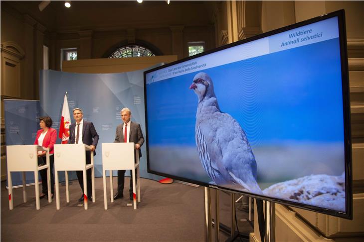 Sichtbar wurde die Vernetzung heute (7. Juni) auch anhand der zahlreichen Bilder und Daten, welche die beiden Landesräte Hochgruber Kuenzer und Schuler präsentierten. Diese umfassten unter anderem den Bereich der Renaturierung der Fließgewässer: Einerseits wird damit der Hochwasserschutz gewährleistet, andererseits wird dabei dem ökologischen Gedanken der Wiederansiedelung unterschiedlicher Tier- und Pflanzenarten Rechnung getragen. Das Land habe bisher 41 Millionen Euro für insgesamt 118 umgesetzte und 43 in Umsetzung befindliche Projekte investiert, weiter Projekte dieser Art seien bereits genehmigt und über 300 als Projektideen deponiert. "Wir schaffen wichtige Voraussetzungen, damit autochthone Arten wieder gezüchtet und schließlich ausgebracht werden können", erklärte Landesrat Schuler. Dies erfolge beispielsweise in der ehemaligen Landesfischzucht, welche zum aquatischen Artenschutzzentrum umstrukturiert wird. Ein wichtiger Bereich ist zudem der Wald, der immerhin die Hälfte der Landesfläche ausmacht. Auch hier setze man vermehrt auf naturnahen Waldbau, berichtete Schuler, der zudem die Entwicklung der Wildtiere und damit einhergehend die Landschaftsentwicklung aufzeigte. In diesem Zusammenhang sei auch die Wiederansiedelungsprojekte des Steinwilds zu nennen, wobei die Jägerschaft eine wichtige Rolle einnehme. Die Land- und die Forstwirtschaft, die gemeinsam über 80 Prozent der Landesfläche ausmachen, werde auch zukünftig bei der Förderung der Artenvielfalt eine wichtige Rolle einnehmen.