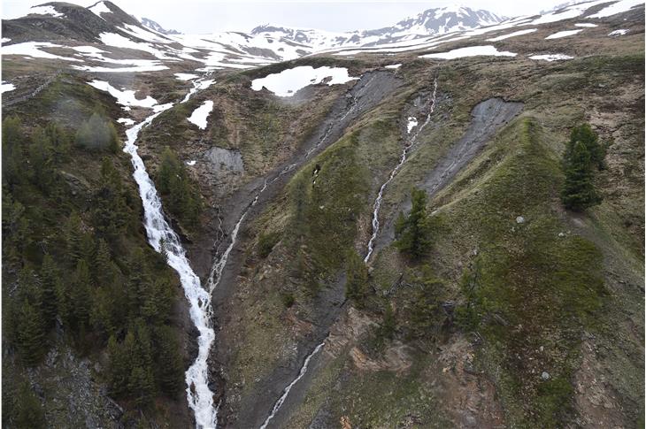 Gestern (12. Juni) Vormittag verschafften sich die Sachverständigen vor Ort einen Überblick über die Situation. "Die Straße", berichtet der Direktor des Amtes für Wildbach- und Lawinenverbauung West Roland Schweitzer, "blieb noch einen Tag länger geschlossen, da die Gefahr von Murenabgängen weiter bestand; verantwortlich dafür ist vor allem die raschere Schneeschmelze wegen der hohen Temperaturen."