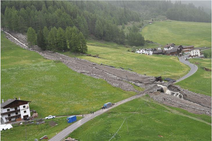 Seit heute früh um 7 Uhr ist die Straße wieder geöffnet. Aufgrund der starken Schneeschmelze übermurte vorgestern (11. Juni) Mittag der Patscheider Bach in Patscheid im Langtauferer Tal die Landesstraße (LS 49) bei Kilometer 7, am Nachmittag gegen 16 Uhr erfolgte ein weiterer Murschub an derselben Stelle.