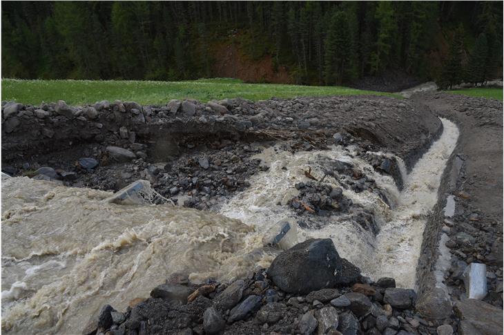 Der Patscheider Bach in Patscheid im Langtauferer Tal ist über die Ufer getreten und hat die Landesstraße unpassierbar gemacht. Foto: Agentur für Bevölkerungsschutz/Luca Messina