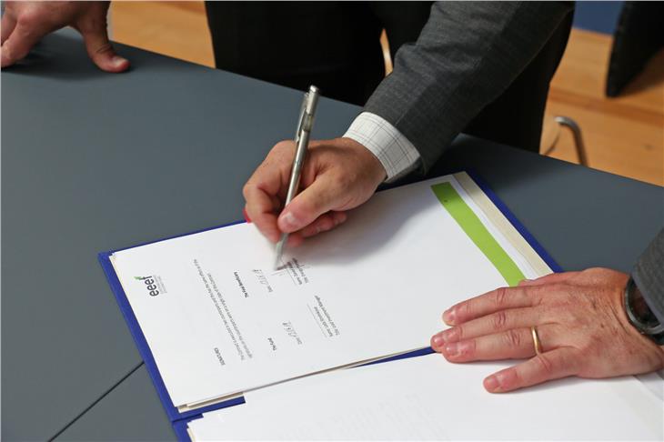 Die Vereinbarung ist unterzeichnet: eeef-Vertreterin Strelnikova, LR Bessone und Energy-Manager Bedin (FOTO: LPA/Angelika Schrott)