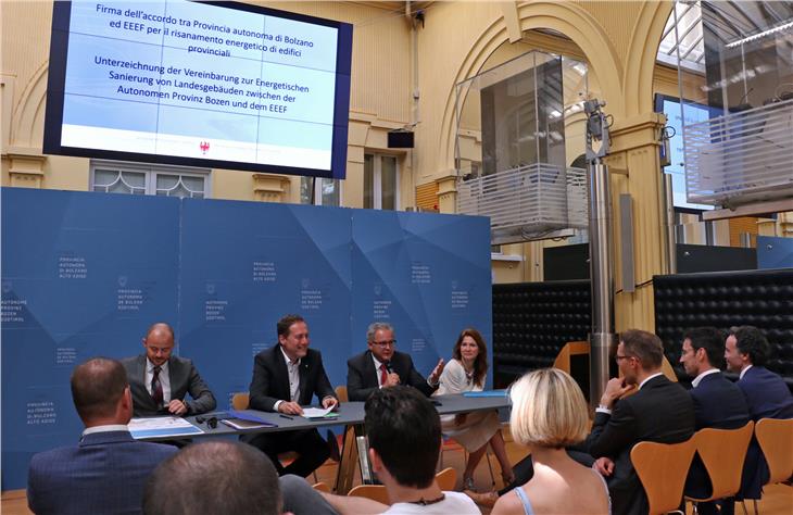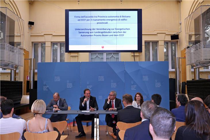27 Gebäude in Landesbesitz sollen in Kürze weniger Energie verbrauchen. Für die damit verbundenen Maßnahmen würden Investitionen von rund 56 Millionen Euros anfallen. Deshalb sollen nun Unternehmen die Arbeiten an Dächern, Fassaden, Fenstern, Beleuchtungs- und Heizungssystemen für das Land übernehmen. Dafür ermöglicht ihnen das Land Zugriff auf Gelder aus dem von der Europäischen Kommission eingerichteten Fonds eeef (European Energy Efficiency Fund www.eeef.eu) und die Unterstützung aus dem Program Horizon 2020 ELENA und sie bekommen umfassende Beratung, um das Investitionsprogram vorzubereiten. Bautenlandesrat  Massimo Bessone hat das Vorhaben in Form einer öffentlich-privaten Partnerschaft am 13. Juni, in Bozen gemeinsam mit Generalsekretär Eros Magnago, dem Energy-Manager des Landes Daniel Bedin, der eeef-Vertreterin Lada Strelnikova, dem Direktor des Instituts für erneuerbare Energien der Europäischen Akademie (Eurac) Wolfram Sparber und dem Präsidenten der Agentur PensPlan Invest SGR Alexander Gallmetzer unterzeichnet.