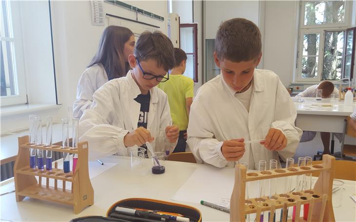 Im Workshop "Lego- WeDo 2.0 und ScratchJr – eine faszinierende Welt!" arbeiteten die Kinder mit Hilfe des Tablets und einer einfachen Programmiersprache an selbst gebauten Lego-Modellen. Die Referentin Angelika Engl unterstützte sie dabei, die elementare Logik des Programmierens kennenzulernen. Warum eine Kerze im Wasserglas brennt und Flüssigkeiten plötzlich ihre Farbe wechseln erörterten die Teilnehmenden des Workshops "Chemie und Physik hautnah" zusammen mit den Referentinnen Katja Grai und Elisabeth Wieser. Workshop-Teilnehmer Leonardo war begeistert: "Ich finde toll, dass wir wie richtige Profis arbeiten." Marla war stolz auf die Arbeitsergebnisse: "Ich habe gelernt, was ein Indikator ist und wie man Säuren und Laugen unterscheidet. Ich finde es toll, dass wir eigenständig arbeiten und forschen dürfen."