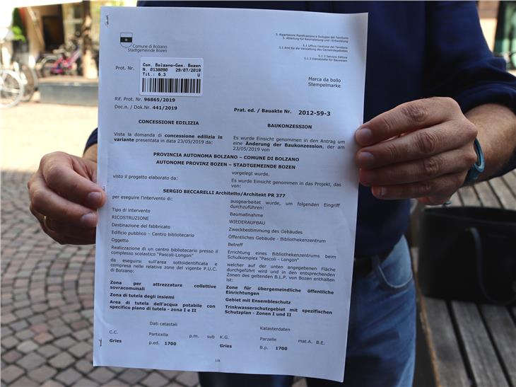 Am 29. Juli wurde sie ausgestellt, heute, 1. August, hat Hochbaulandesrat Massimo Bessone sie persönlich in der Gemeinde Bozen abgeholt: Die Baukonzession für das Projekt des Bibliotheken- und Medienzentrums in der ehemaligen Pascoli-Schule in Bozen, in dem die Landsbibliotheken "Teßmann" und "Claudia Augusta" sowie die Bozner Stadtbibliothek unter ein Dach kommen. Damit ist laut Bessone ein weiterer formaler Schritt gesetzt, um das Bibliothekenzentrum zu verwirklichen. „Innerhalb Herbst 2019 wollen wir das Einreichprojekt für dieses wichtige Vorhaben für die Stadt Bozen und das ganze Land vorbereiten und genehmigen", betont Bessone.