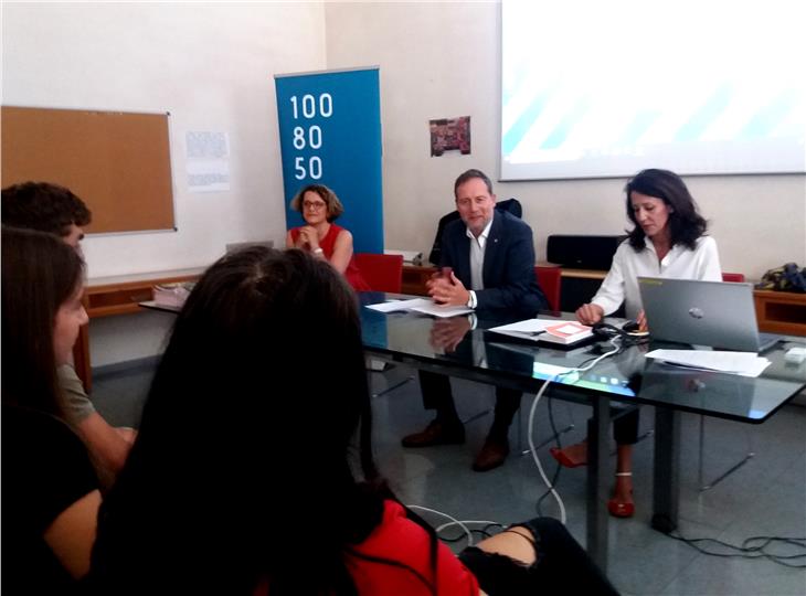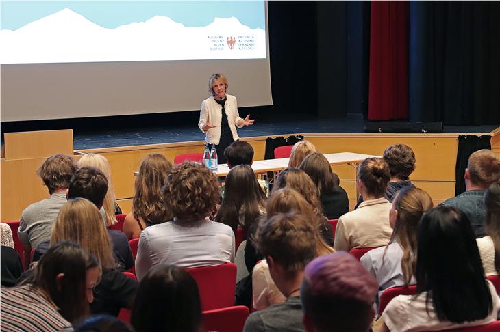 - Mit deutsch- und italienischsprachigen Maturanten diskutierte LRin Deeg in Bruneck. (Foto LPA) [JPG 50 KB]