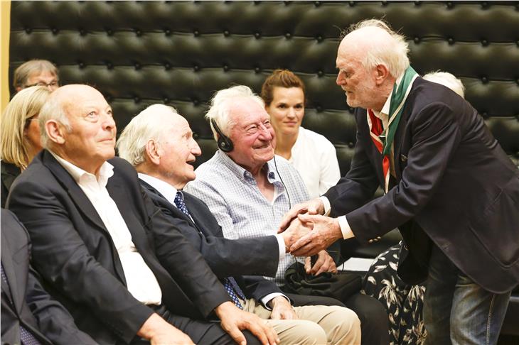 - Zwei "Gestalter der Autonomie" durften bei der Feier nicht fehlen: Altlandeshauptmann Luis Durnwalder und Altsenator Roland Riz (1.u.2.v.l.). (Foto LPA Oskar Verant) [JPG 58 KB]