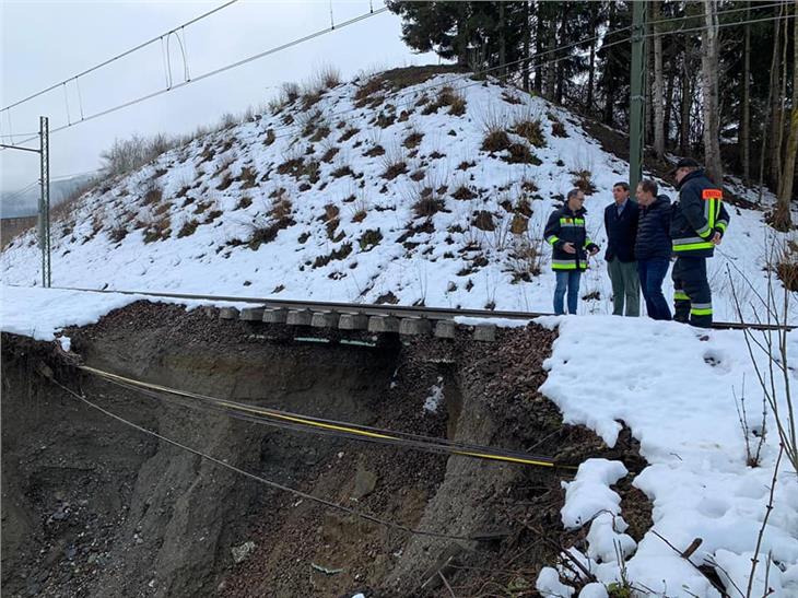 Nach zwei Erdrutschen und großen Gesteinsbrocken auf mehreren Bahnabschnitten ist derzeit nicht absehbar, wann die Bahnlinie im Pustertal, auch nur teilweise, wieder in Betrieb gehen kann. Mobilitätslandesrat Daniel Alfreider, der für Geologie zuständige Landesrat Massimo Bessone, Bürgermeister Georg Reden, Vize-Landesgeologe Claudio Carraro und Vertreter der Freiwilligen Feuerwehr Oberolang haben sich heute in der Früh ein Bild von der Situation in Oberolang geamcht, wo gestern ein Erdrutsch die Bahnlinie unterbrochen hatte.