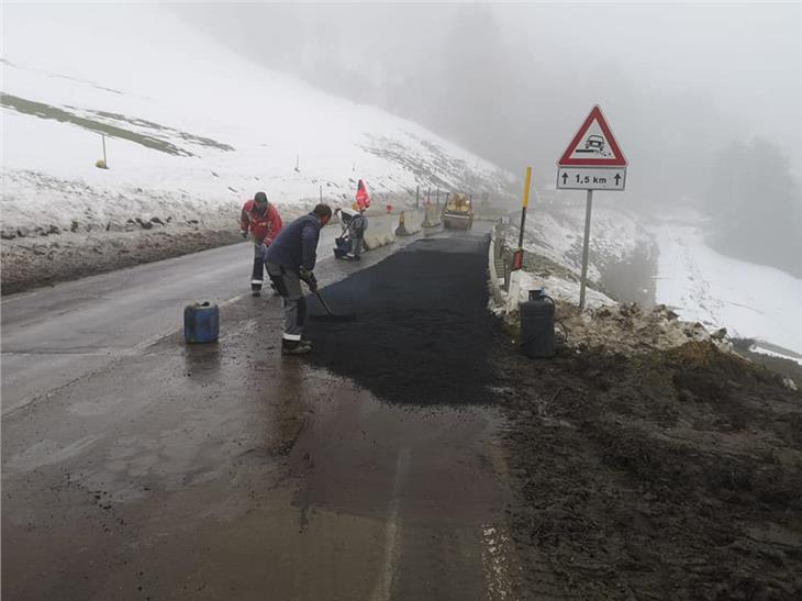 - Der abgerutschte Abschnitt der Pustertaler Staatsstraße am Kniepass ist befestigt und asphaltiert: Bald geht es auf der Straße wieder zweispurig weiter (Foto: LPA) [JPG 45 KB]