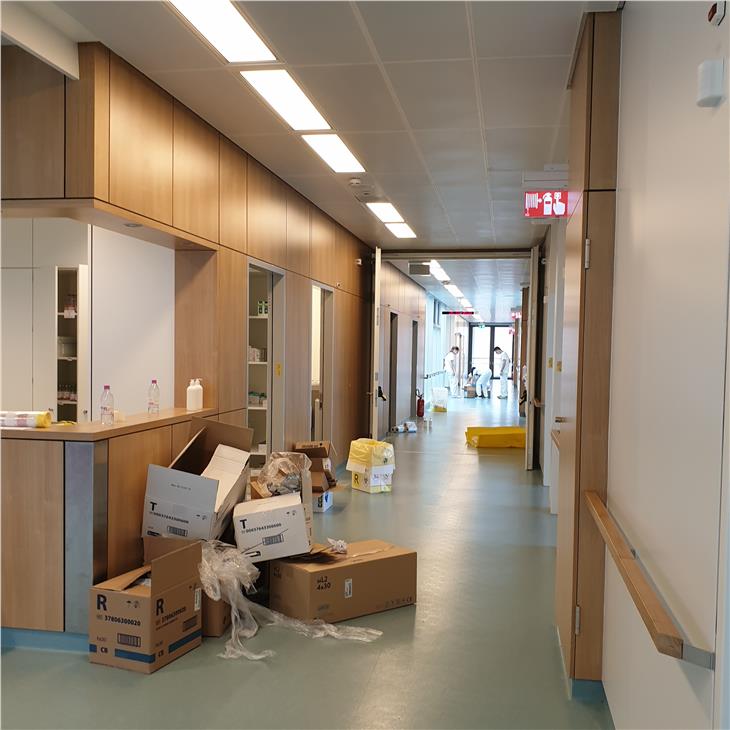 Der Südtiroler Sanitätsbetrieb hat bereits vor Wochen die Arbeiten im neuen Trakt des Landeskrankenhauses Bozen intensiviert, um rechtzeitig eventuell zusätzlich benötigte Corona-Betten bereitstellen zu können. Mit voller Kraft wurde seit Wochen an der Fertigstellung der benötigten Teile des Trakts gearbeitet, um diese bezugsfertig zu machen. Mit Dienstag dieser Woche erfolgte dann die technische Freigabe der Räumlichkeiten und es konnte mit der Bestückung und Ausstattung begonnen werden. Innerhalb von drei Tagen schafften es die beteiligten Abteilungen und Dienste in einem gemeinsamen Kraftakt die Räumlichkeiten mit allen benötigten Materialien und Einrichtungen auszustatten.