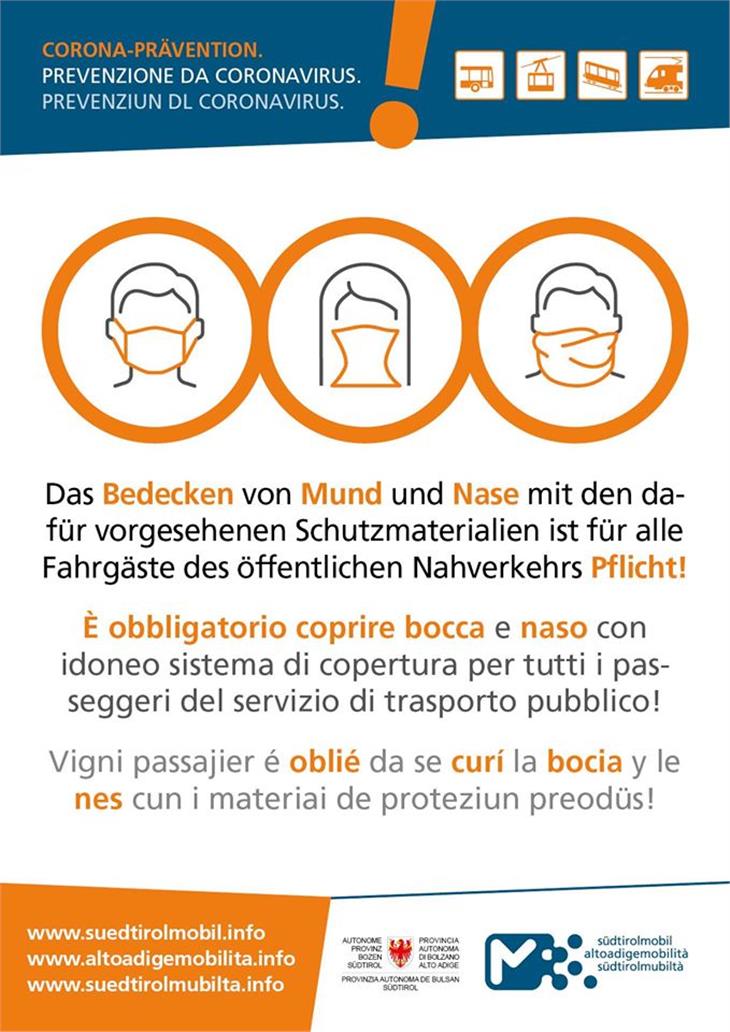 Mobilitätslandesrat Daniel Alfreider betont: "Wir wollen den Menschen die Möglichkeit geben, mit Bus und Bahn zur Arbeit zu fahren, allerdings steht immer der Schutz der Gesundheit an erster Stelle. Mund-Nasen-Schutz, Abstand halten, Stoßzeiten vermeiden und ähnliche Vorsorgemaßnahmen werden für uns alle zur Gewohnheit werden müssen, wenn wir in unsere individuelle und wirtschaftliche Freiheit und ins übliche gesellschaftliche Leben wieder zurückwollen." Die öffentlichen Verkehrsmittel würden sukzessive wieder fahren, allerdings mit strengen Sicherheitsvorschriften, die von allen Fahrgästen einzuhalten sein. "Eigenverantwortung Von jedem von uns ist hier oberstes Gebot", unterstreicht der Landesrat. Von Seiten des Landes jedenfalls, so Alfreider, werde alles daran gesetzt, die Menschen wie gewohnt, pünktlich und sicher aber auch gesund zu transportieren.
