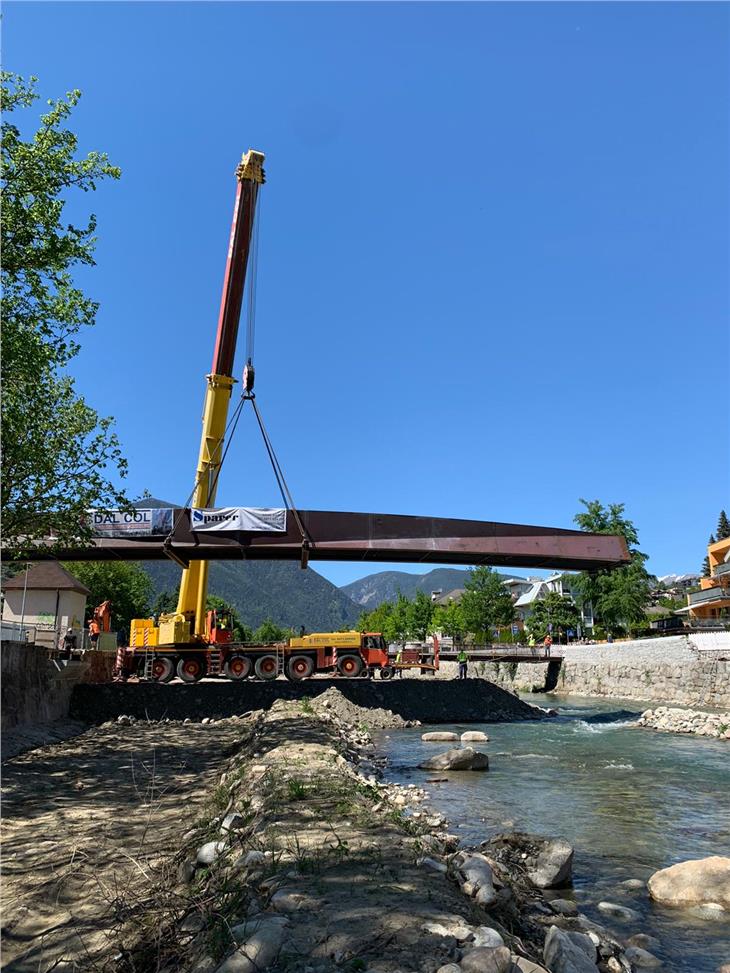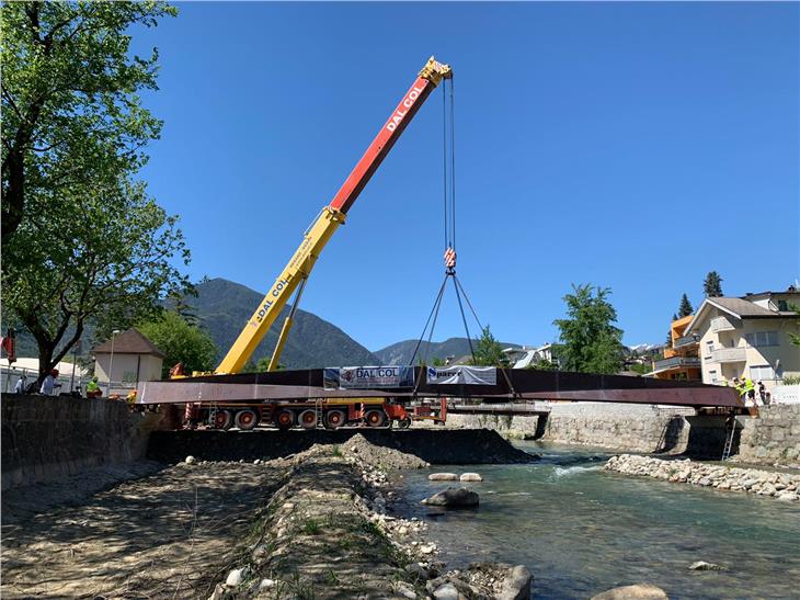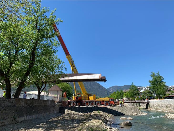 Das Landesamt für Wildbach- und Lawinenverbauung Nord der Agentur für Bevölkerungsschutz setzt nun die Arbeiten zum Schutz gegen ein 100-jähriges Hochwasser des Eisacks in Brixen fort. Heute (7. Mai) wurde die neue Fußgängerbrücke in Priel etwas südlich des derzeit bestehenden Bombenbrüggeles montiert, ohne Stützen und mit einer höheren Brückenunterkante.