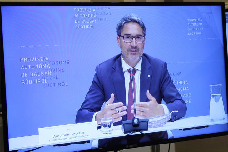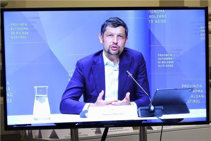 - Alfreider am Bildschirm in Pressesaal des Landes Südtirol bei der heutigen Landesmedienkonferenz (Foto: LPA/Franco Grigoletto) [JPG 50 KB]