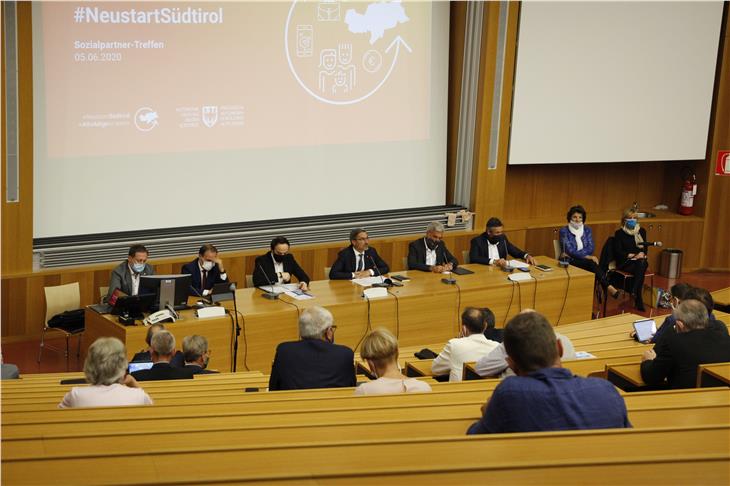 Wirtschaft und Sozialwesen, Jung und Alt, Männer und Frauen - alle sollten in dieser Corona-Phase 2 zusammenhalten, um den Neustart voranzutreiben und eine zweite Infektionswelle zu vermeiden oder möglichst klein zu halten, da es einen zweiten Lockdown nicht geben dürfe. Dies forderte Soziallandesrätin Waltraud Deeg bei dem heutigen (5. Juni) Treffen der Landesregierung mit den Sozialpartnern in der Aula Magna der Universität Bozen