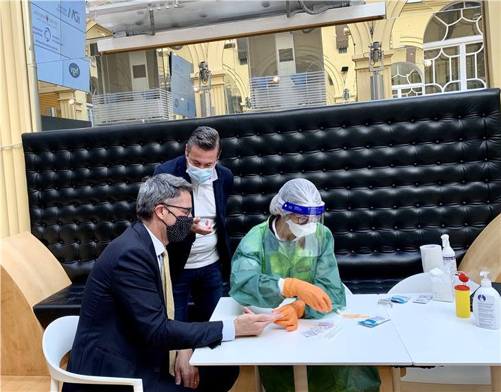 Um zu zeigen, wie unkompliziert die Tests ablaufen, wurden bei der Präsentation gleich Landeshauptmann Kompatscher und HGV-Direktor getestet. Dazu haben der Direktor des Weißen Kreuzes, Ivo Bonamico, und der stellvertretende Leiter des medizinischen Notfallmanagements, Patrick Franzoni, den Versuchspersonen am Finger einige Tropfen Blut abgenommen, das dann auf einen Teststreifen gegeben wurde. Die Testergebnisse liegen innerhalb einer Viertelstunde vor.