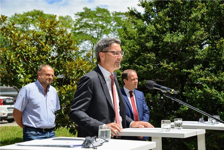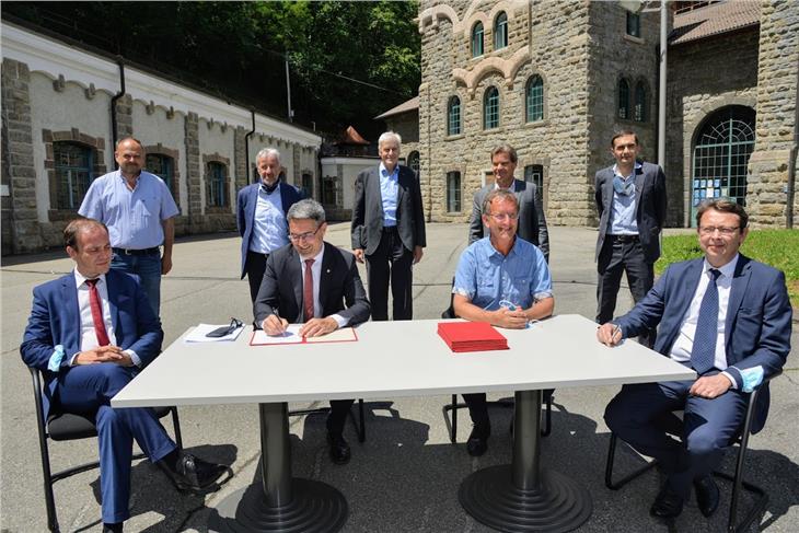 Sämtliche Details zum Projekt sind in einem Abkommen enthalten, das Landeshauptmann Arno Kompatscher und Energie- und Umweltlandesrat Giuliano Vettorato stellvertretend für das Land Südtirol, die Bürgermeister der betroffenen Gemeinden Algund, Marling, Meran, Kuens, Dorf Tirol und Riffian und Alperia Greenpower-CEO Mario Trogni heute (29. Juni) beim Wasserkraftwerk Töll in der Gemeinde Algund unterzeichnet haben.