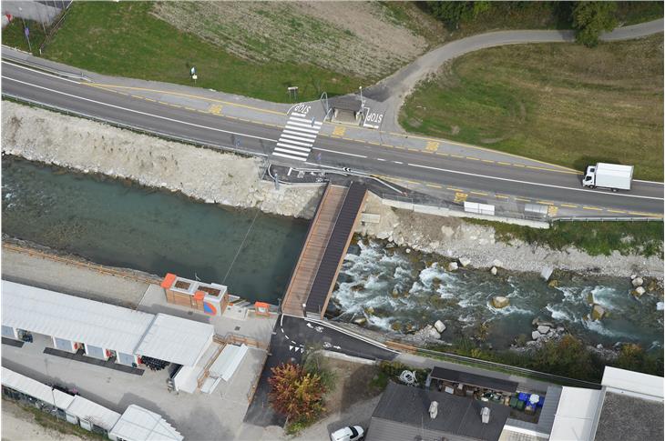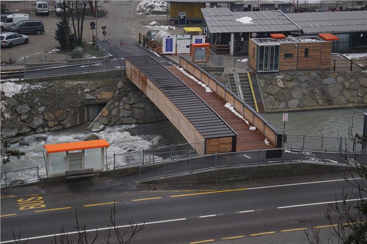 - Liefert wichtige Daten besonders auch im Ereignisfall: die neue Pegelmessstelle an der Gader in Montal, im Bild mit dem blau/orangefarbenen Zivilschutz-Logo links vom Steg. (Foto: Agentur für Bevölkerungsschutz/Luca Messina) [JPG 73 KB]