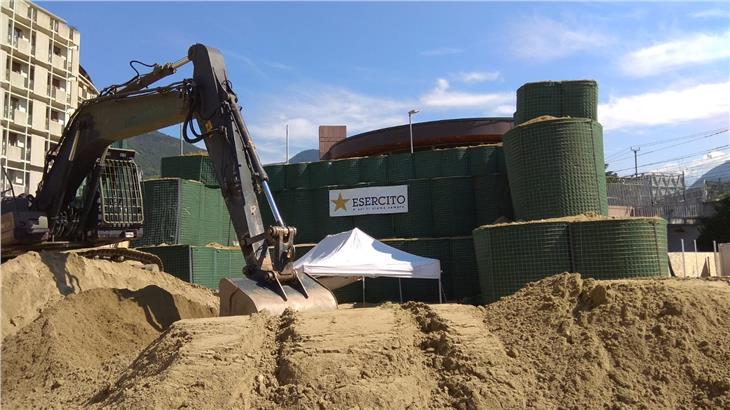 - Bis zur Entschärfung an diesem Sonntag ist der Blindgänger von einem Schutzwall umgeben, den das Militär errichtet hat. (Foto: Comando Truppe Alpine) [JPG 64 KB]