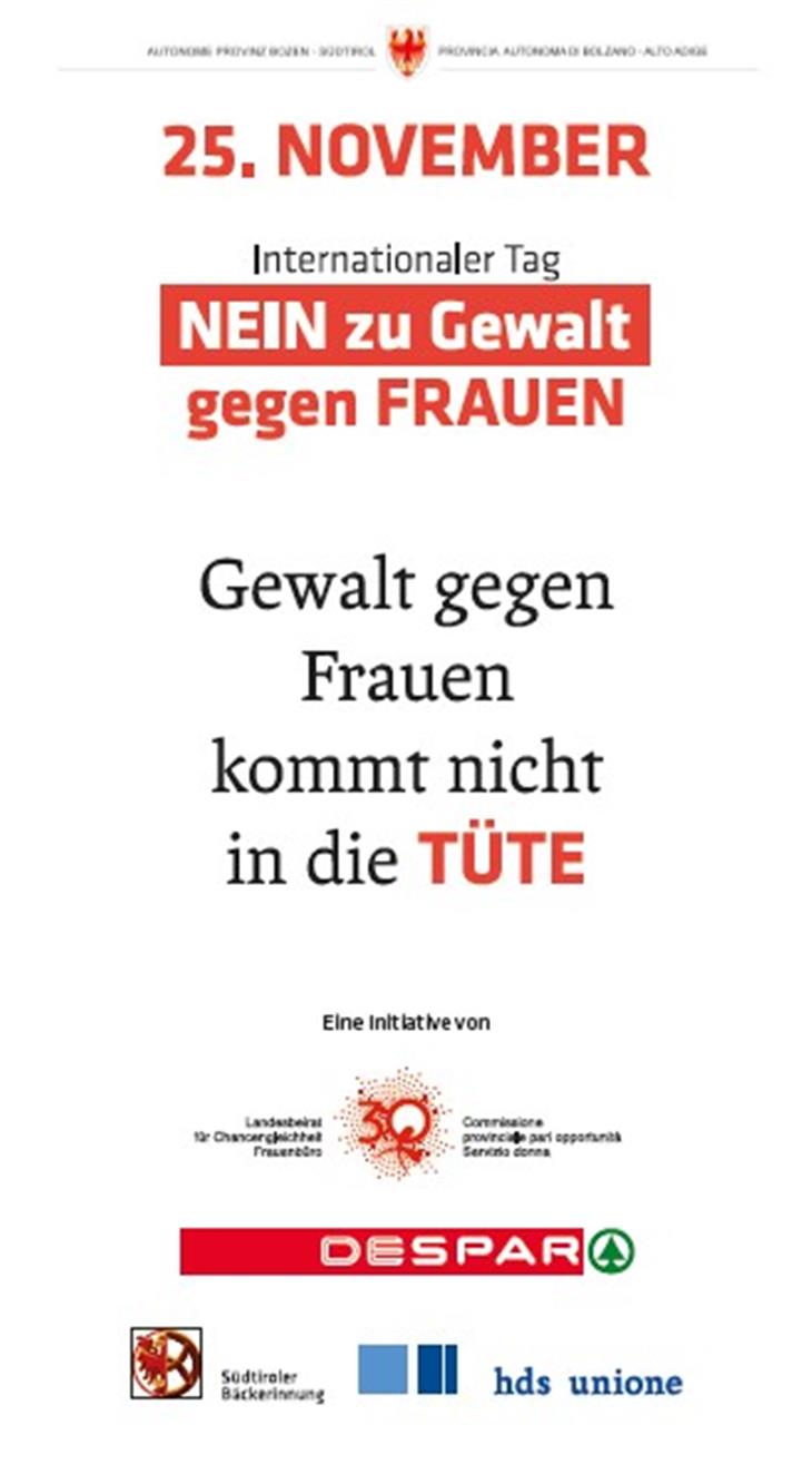 Die Präsidentin des Beirates für Chancengleichheit Ulrike Oberhammer ist besorgt: "Südtirol erlebt wie ganz Europa im Jahr 2020 im Sog der Corona-Pandemie eine tiefe Krise im Zusammenleben, welche leider auch durch viele Anzeichen von Gewalt, insbesondere im Familienkreis, geprägt ist. Aus diesem Grund ist die erste Aktion des Jahres der Chancengleichheit diesem Thema gewidmet." Man greife dabei auf eine Kampagne zurück, die bereits im Jahr 2003 erstmals durchgeführt wurde. "Diese Initiative wurde in den Jahren danach von verschiedenen Organisationen aufgegriffen. Dafür gilt allen ein herzlicher Dank", ergänzt Vizepräsidentin Donatella Califano. Der Landesbeirat und das Frauenbüro des Landes stellen unter dem Motto "Gewalt gegen Frauen kommt nicht in die Tüte" kostenlos Brotsäckchen aus Papier aus geprüfter Lebensmittel­verpackung zur Verfügung. Diese werden vom Internationalen Tag gegen Gewalt an Frauen am 25. November bis zum Internationalen Tag der Menschenrechte am 10. Dezember 2020 in den Bäckereien bzw. Lebensmittelgeschäften der Gemeinden verteilt.