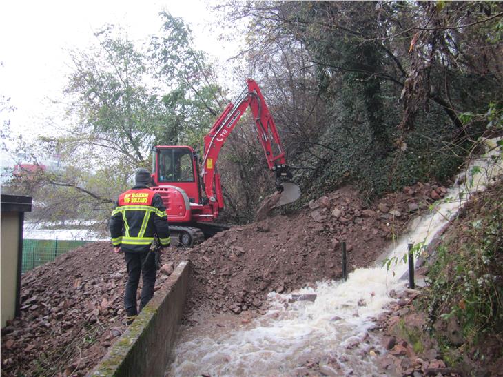 Nahe der Talstation der Kohlerer Seilbahn in Bozen hat die Berufsfeuerwehr heute Vormittag den überschwemmten Parkplatz freigepumpt und ein durch einen Murenabgang verlegtes Abflussgitter freigelegt und damit die Gefährdung des Hauptverteilers für Methangas abgewandt, der die Stadt Bozen mit Methangas versorgt. Im Einsatz war dabei auch die Freiwillige Feuerwehr Bozen.