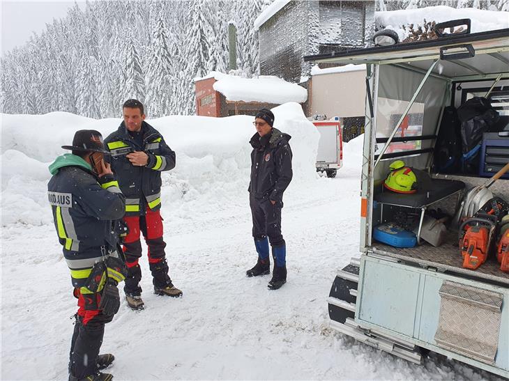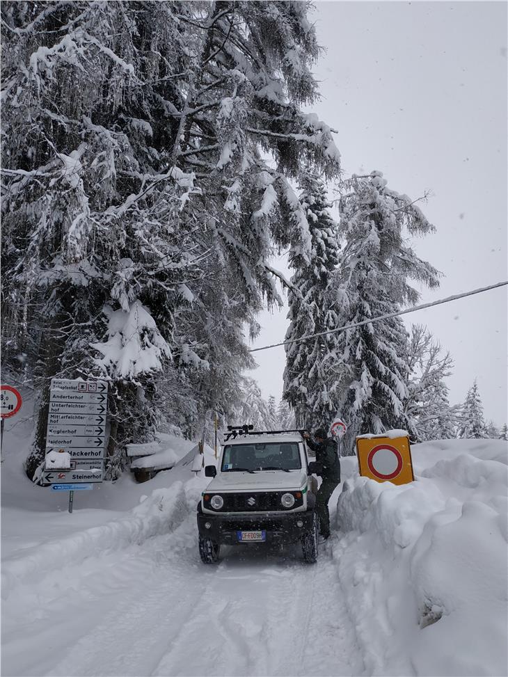 - Auch das Landesforstkorps ist in diesen Tagen der ausnehmend großen Schneemengen in Südtirols Wäldern im Einsatz; im Bild Mitarbeiter der Forststation Toblach. (Foto: LPA/Forststation Toblach) [JPG 150 KB]