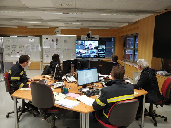 - Bei drei Lagebesprechungen wird im Landeslagezentrum täglich die Situation auf den Punkt gebracht; im Bild jene von heute Vormittag mit Leiter Stab Lazzarotto (l.) und Agenturdirektor Pollinger (r.) (Foto: Berufsfeuerwehr) [JPG 65 KB]